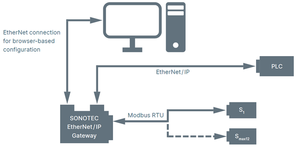 The EtherNet/IP Gateway efficiently connects up to 12 SONOFLOW or SEMIFLOW ultrasonic clamp-on or inline flow meters to a PLC controller in an EtherNet-based system environment. The widely accepted EtherNet/IP protocol allows reliable real-time communication and data exchange between the sensors and the PLC. The EtherNet/IP Gateway offers a number of standard parameters and commands, which can be selected according to the application requirements.
